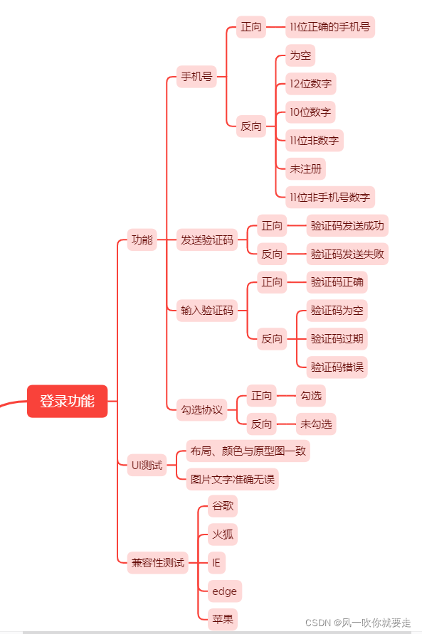 编写测试用例时,正向用例一次可以覆盖多个正向的测试点,反向测试用例一次只能有一个反向测试点(类似于控制变量,每一个用例只能有一个不符合需求的点,如果反向测试点不单一那就说明不了是其中的哪个点有问题)。