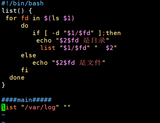 list() {for fd in $(ls $1) doif [ -d "$1/$fd" ];then echo "$2$fd 是目录" #如果是目录就输出这个目录 list "$1/$fd" " $2"elseecho "$2$fd 是文件" 不是目录则输出$fdfidone