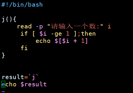 #!/bin/bashj(){ #定义函数read -p "请输入一个数:" i #给i赋值if [ $i -ge 1 ];then #如果赋的值大于等于1时执行操作echo $[$i + 1] #输出fi