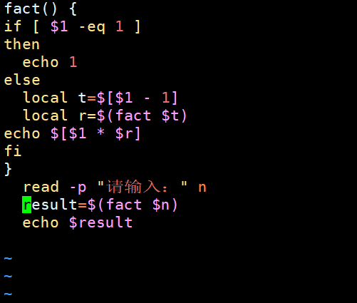 }read -p "请输入:" n 定义一个值result=$(fact $n) 进入函数算出值echo $result