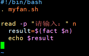 . myfan.sh # 调用函数库read -p "请输入:" n #定义参数result=$(fact $n) #输出函数echo $result #输出结果
