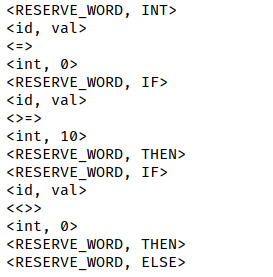 void Lexical_Analysis::StateTransition::print_token(Lexical_Analysis::Token *token) {RelopToken* relopToken;ReserveWordToken* reserveWordToken;IdToken* idToken;IntToken* intToken;DoubleToken* doubleToken;if ((relopToken = dynamic_cast<RelopToken*>(token))) {std::cout << "<" << getRelopTagStr(relopToken->relop) << ">" << std::endl;} else if ((reserveWordToken = dynamic_cast<ReserveWordToken*>(token))) {std::cout << "<" << getTagStr(reserveWordToken->tag) << ", " << getReserveWordTagStr(reserveWordToken->reserveWordTag) << ">" << std::endl;} else if ((idToken = dynamic_cast<IdToken*>(token))) {std::cout << " << idToken->value << ">" << std::endl;} else if ((intToken = dynamic_cast<IntToken*>(token))) {std::cout << " << intToken->value << ">" << std::endl;} else if ((doubleToken = dynamic_cast<DoubleToken*>(token))) {std::cout << " << doubleToken->value << ">" << std::endl;}}std::string Lexical_Analysis::StateTransition::getTagStr(Lexical_Analysis::Tag val) {if (val == Tag::RESERVE_WORD) return "RESERVE_WORD";else if (val == Tag::ID) return "ID";else if (val == Tag::RELOP) return "RELOP";else if (val == Tag::METHOD) return "METHOD";else if (val == Tag::NUM) return "NUM";return std::__cxx11::string();