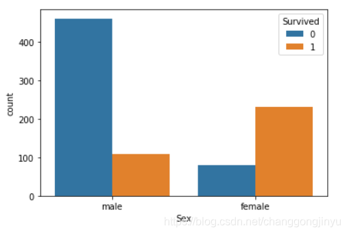 可以看出,训练集中男性的人数(570)比女性(310)多很多,但存活男性的数量(109)还不到存活女性的数量(231)的一半,女性的存活率达到了74%,而男性的存活率只有20%,这说明Sex是一个对存是否存活影响比较大的特征。