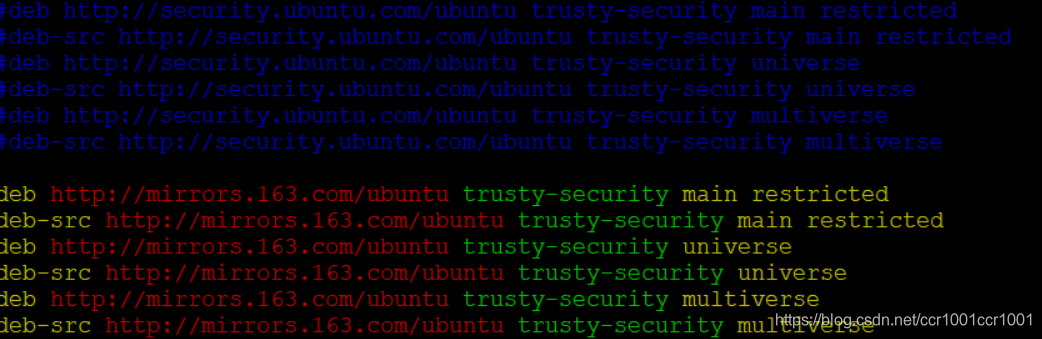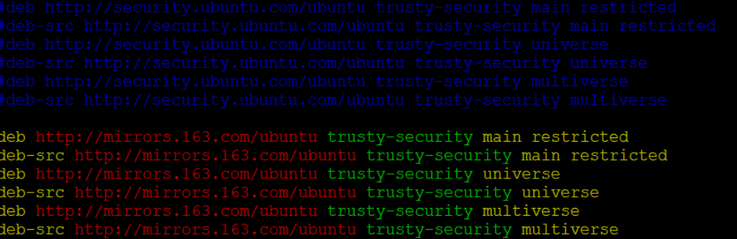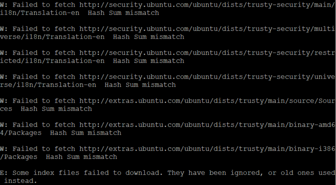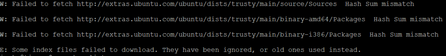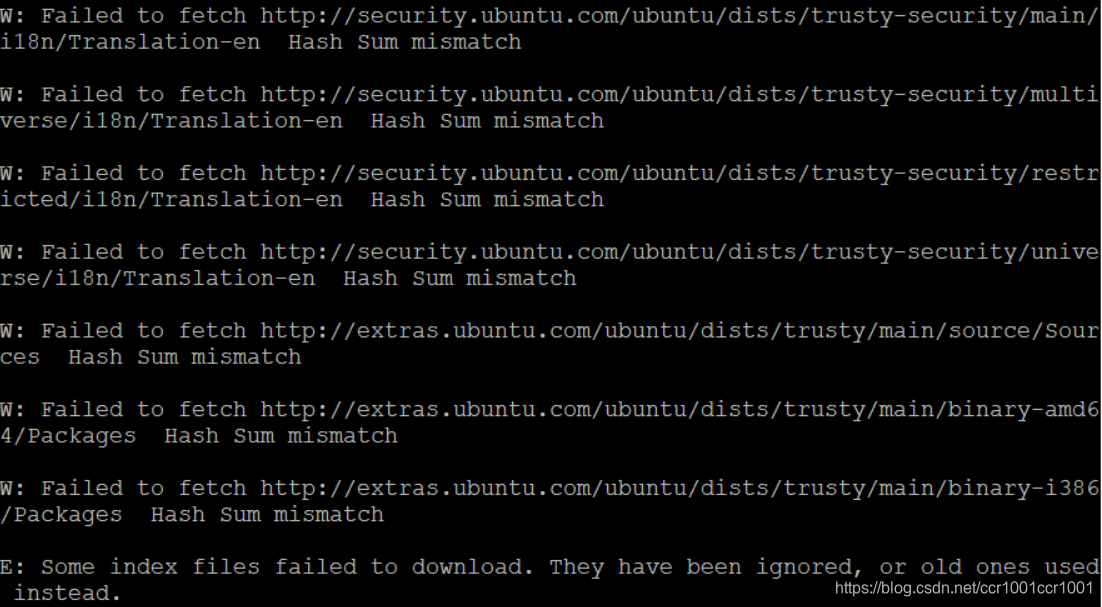 其中W: Failed to fetch http://security.ubuntu.com/ubuntu/dists/trusty-security/main/source/Sources Hash Sum mismatch 通过修改源解决: