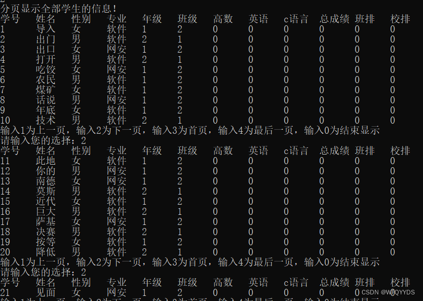 else printf("%-6d %-6s %-6s %-6s %-6d %-6d %-6d %-6d %-6d %-6d %-6d %-6d \n",p1->num,p1->name,"女",p1->professional,p1->grade,p1->Class,p1->advancemath,p1->English,p1->clanguage,p1->totalscore,p1->Classrank,p1->schoolrank);