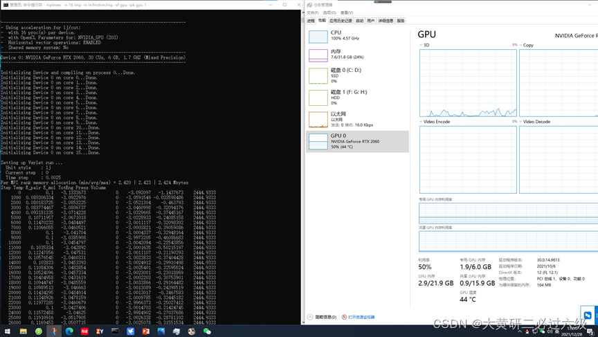 此时打开任务管理器可以看到CPU的所有线程和GPU都在运行算例