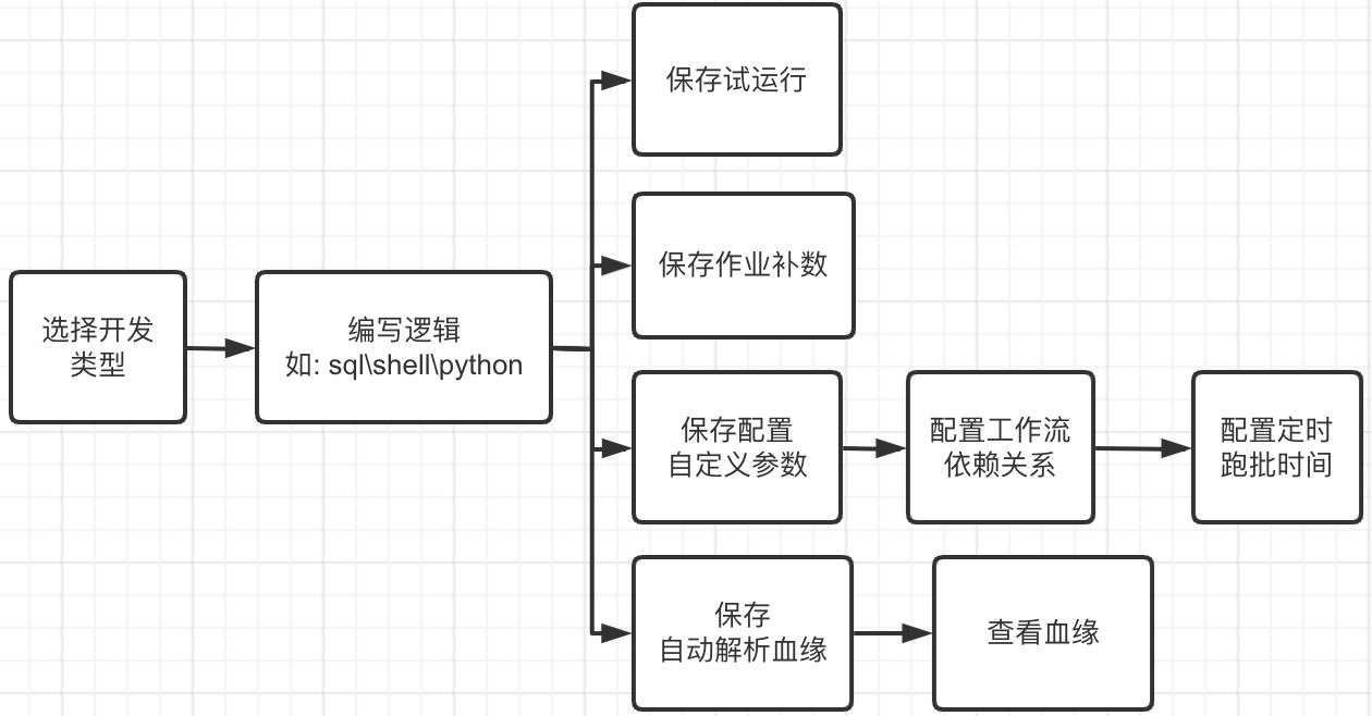作业开发:可新增sqoop同步、导出作业、新增 hive、impala、python、shell类型作业;每次保存记录历史版本;可设置自定义参数;可自动拆解血缘;可单作业循环补数;可单作业试运行;可直接配置工作流和定时调度;可设置作业优先级