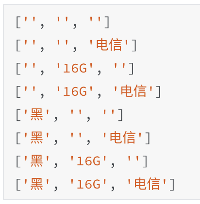 观察以上,其实数组第一个选项要不就是黑,要不就是'',第二个选项要不就是16G,要不就是'' ,第三个选项要不就是电信,要不就是'' 。