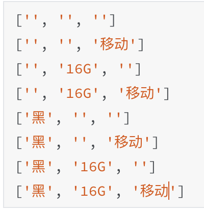 观察上面的数据,我们发现有相同属性的集合,比如['', '', ''] ['', '16G', ''] ['黑', '16G', ''] 等等……