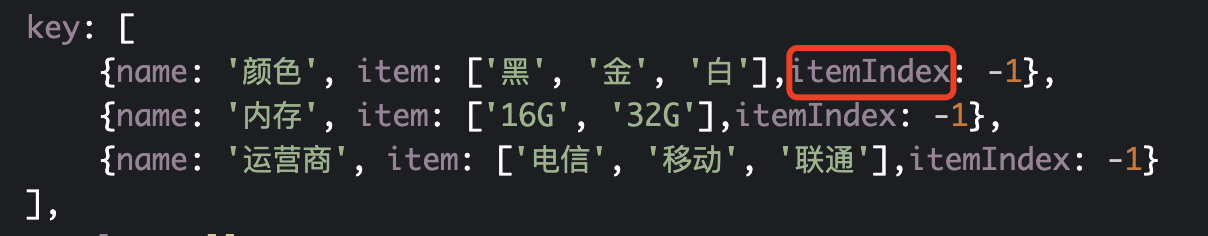var key = [{name: '颜色', item: ['黑', '金', '白']},{name: '内存', item: ['16G', '32G']},{name: '运营商', item: ['电信', '移动', '联通']}