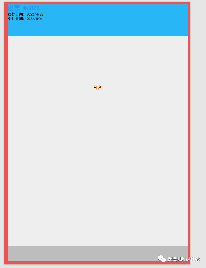 public void Compose(IDocumentContainer container){container.Page(page =>{page.PageColor(Colors.Red.Lighten1);page.Size(PageSizes.A4);page.Margin(10);//外边距page.Header().Height(100).Background(Colors.LightBlue.Lighten1).Element(ComposeHeader);page.Content().Background(Colors.Grey.Lighten3);page.Footer().Height(50).Background(Colors.Grey.Lighten1);});}void ComposeHeader(IContainer container){var titleStyle = TextStyle.Default.FontSize(20).SemiBold().FontColor(Colors.Blue.Medium);container.Row(row =>{row.RelativeItem().Column(column =>{column.Item().Text($"发票 #{Model.InvoiceNumber}").FontFamily("simhei").Style(titleStyle);column.Item().Text(text =>{text.Span("发行日期: ").SemiBold().FontFamily("simhei");text.Span($"{Model.IssueDate:d}").FontFamily("simhei");});column.Item().Text(text =>{text.Span("支付日期: ").FontFamily("simhei").SemiBold();text.Span($"{Model.DueDate:d}").FontFamily("simhei");});});});}