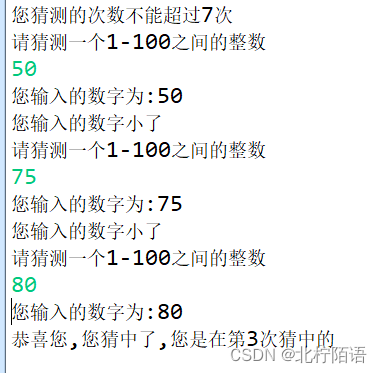 //1.生成随机数Scanner sc = new Scanner(System.in);int num = (int)(Math.random()*99 +1);//System.out.println("随机生成的数字为:" + num);//2.提示可以猜测的次数System.out.println("您猜测的次数不能超过7次");int i = 1;//开始是第一次//3.while判断猜测的次数while(i < 8){System.out.println("请猜测一个1-100之间的整数");int guessNum = sc.nextInt();System.out.println("您输入的数字为:" + guessNum);if(guessNum < num){System.out.println("您输入的数字小了");}else if( guessNum > num){System.out.println("您输入的数字大了");}else{System.out.println("恭喜您,您猜中了,您是在第"+i+"次猜中的");break;}i++;//4.判断猜测机会是否用完if(i == 8){System.out.println("很遗憾,您的7次机会用完了,您没有猜中");System.out.println("随机数为:" + num);}}