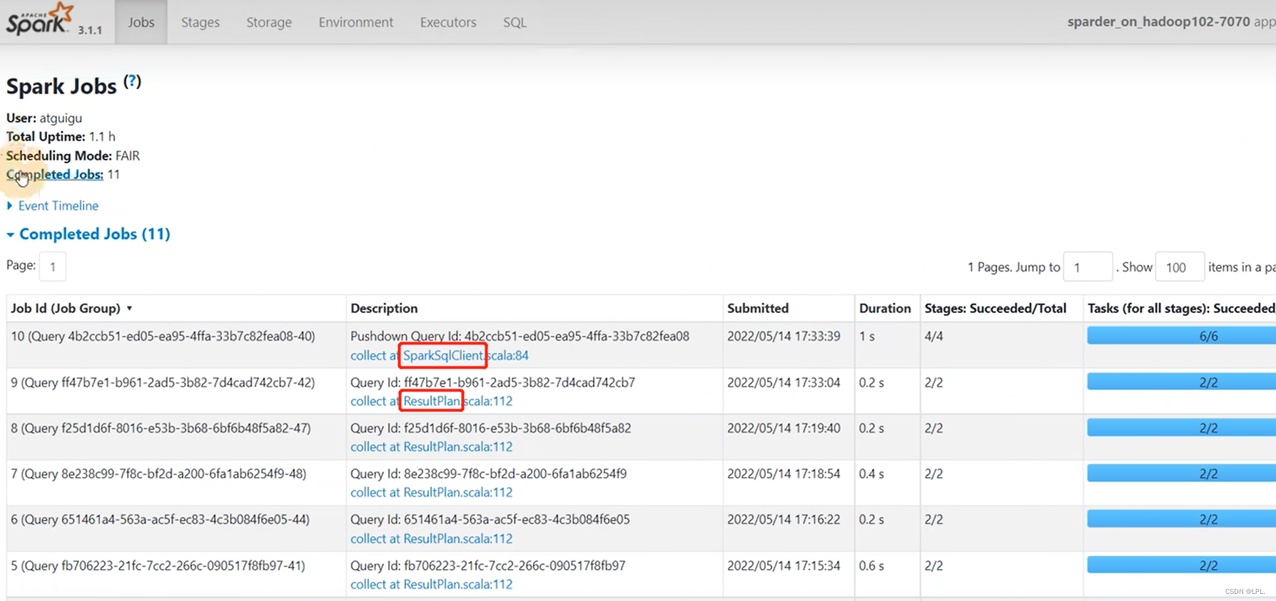 在Insight的New Query中提交查询sql后,可以在System菜单下Sparder可进入kylin sparksql客户端查看具体执行