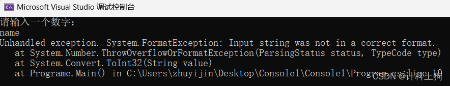 在 C# 中,程序中的运行时错误通过使用一种称为“异常”的机制在程序中传播。 异常由遇到错误的代码引发,由能够更正错误的代码捕捉。 异常可由NET Framework 公共语言运行时(CLR)或由程序中的代码引发。一旦引发了一个异常,这个异常就会在调用堆栈中往上传播,直到找到针对它的 catch 语句。 未捕获的异常由系统提供的通用异常处理程序处理,该处理程序会显示一个对话框。