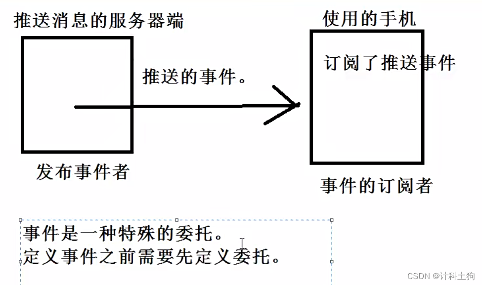 {//手机服务器端的类public delegate void DelSendMsg(string msg);public class MobileServer{//事件是委托的一个实例对象public static event DelSendMsg sendEvent;//有一个方法,就是将服务器端的消息推送给客户端的方法public void SendMsg(string msg){Console.WriteLine("服务器开始给客户端的手机发送推送消息!");//如果是客户端已经订阅了该事件if(sendEvent != null){//事件的执行,事件的执行是关联到具体的事件绑定的方法执行sendEvent(msg);}}}