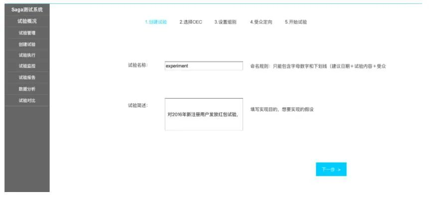 试验管理就是一个A/B试验配置后台,通过页面与用户交互引导用户完成试验关键参数配置,并允许用户对试验进行管理。方便用户快捷的创建A/B测试试验,增加新的A/B测试分组,调整A/B测试方案各个组的比例,让A/B测试运行起来。试验管理模板对实时性要求最高,需要在用户操作调整确定后,实现线上试验随即变更。
