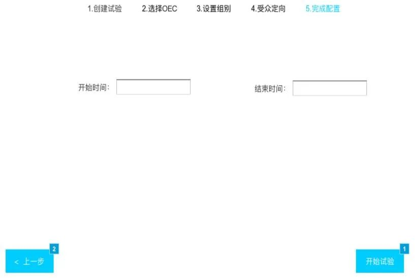 如图8所示,设置开始和结束时间,开始时间必须大于当前系统时间,如果选择了其他时间,则为预约的开始时间。结束时间默认为开始时间+30天,也可以自由选择,试验到结束时间后自动结束,也可以人工手动结束,到时结束时间以手动结束为准。在试验创建成功后根据试验平台的设计会提供URL连接或者代码,需要将这些配置到要试验的页面或功能中,需要技术同事接入。