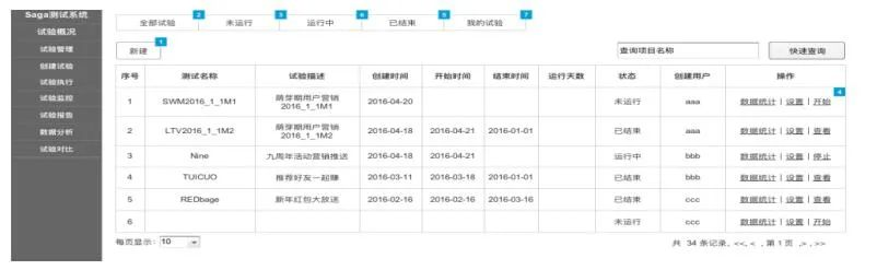 如图3所示,点击页面上部导航条中的不同选项卡,可以切换到不同的表格,默认为"全部试验" ( 包含未运行试验 )。点击"未运行"选项卡,则表格筛选出状态为未运行的所有试验;单击"我的试验"选项卡,则只显示该登录用户创建的试验。