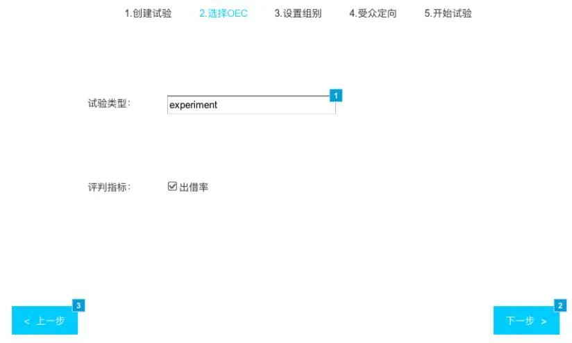 如图5所示,试验类型为,为下拉选项,选择试验是修改哪一类变量,比如PUSH、营销活动、文案素材等。评判指标 ( OEC ),目前出借端定义为出借率=出借人数/参与试验人数*100%。
