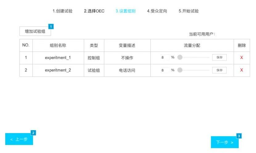 试验用户分配的百分比最小区隔是1% ( 由系统分桶的最小颗粒决定,我们用户按100分桶,故最小用户群为1% ),可以直接填写数值也可以拖动滚动栏,占比必须是整数个百分点,在表格上面有当前可用用户百分比,各组试验用户分配百分比之和不得大于该数值。