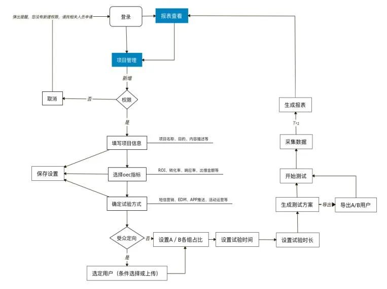 我们介绍完A/B测试的基本概念和核心模块后,知道了每个模块的作用和价值,那么在实际构建A/B测试系统时,这些模块是怎么组织起来提供服务的呢?下面我们就搭建互联网金融公司的实际应用为例,设计一个A/B测试系统。