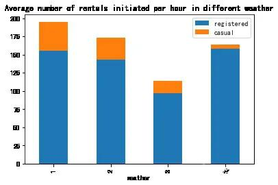 weather_df.plot.bar(stacked=True,title='Average number of rentals initiated per hour in different weather')
