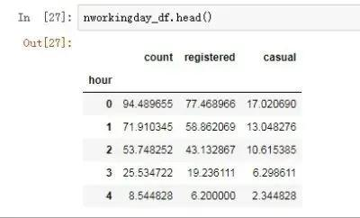 workingday_df = workingday_df.groupby(['hour'],as_index=True).agg({'count':'mean','registered':'mean','casual':'mean'})nworkingday_df = Bikedata[Bikedata['workingday']==0]
