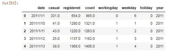 day_df = Bikedata.groupby(['date'], as_index=False).agg({'casual':'sum','registered':'sum','count':'sum', 'workingday':'mean','weekday':'mean','holiday':'mean','year':'mean'})