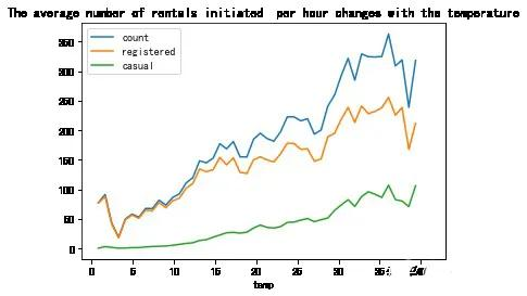 temp_df.plot(title = 'The average number of rentals initiated per hour changes with the temperature')