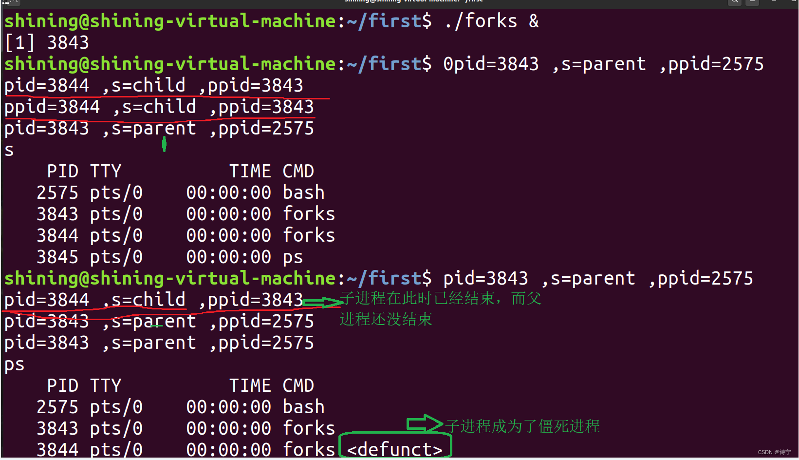 我们在父进程中加入wait函数,不会产生僵死进程,但是在父进程执行wait获取子进程的退出码时,需要子进程全部结束才能获得子进程的退出码