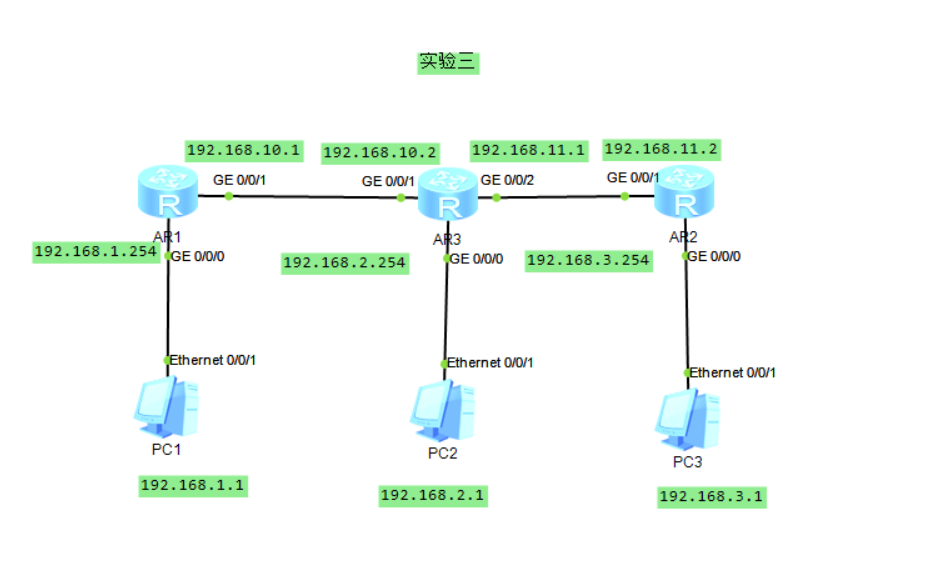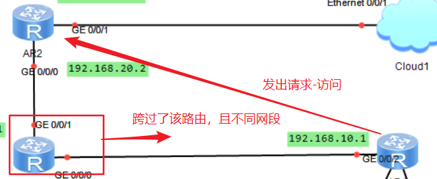 - 非直连网段:跨路由连接,需要通过静态配置或动态配置路由表,连接到不同网段的目标地址,则为非直连网段:如图: