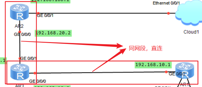 - 直连网段:配置IP地址,端口UP状态,形成直连路由。(就是路由本身延申的连接(同网段),都为直连网段):如图: