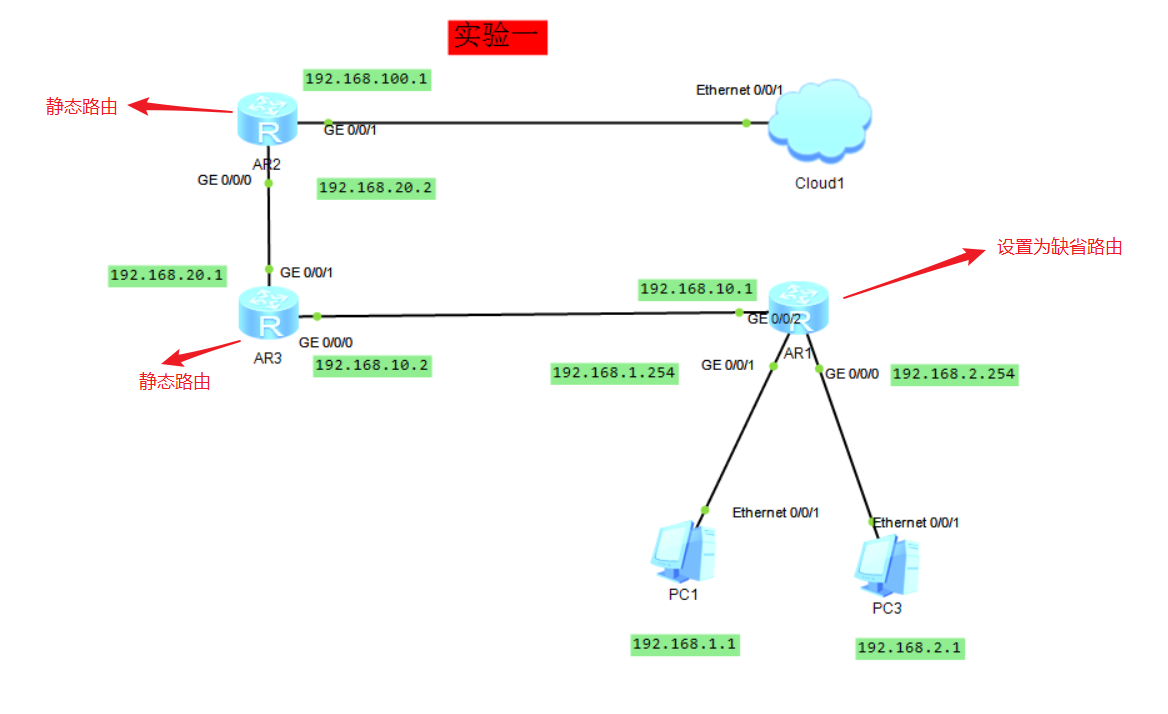 默认路由定义:是对IP数据包中的目的地址找不到存在的其他路由时,路由器所选择的路由,而该配置方式,必须在末节路网络配置,否则会导致环路