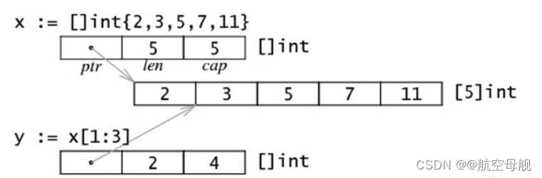 func main() {a := [3]int{0, 1, 2}s := a[1:2]fmt.Println(s, len(s), cap(s)) //[1] 1 2s[0] = 11s = append(s, 12) //slice指向真实地址,数组容量已满s = append(s, 13)s[0] = 21fmt.Println(a) //{0, 11, 12}fmt.Println(s) //21 12 13