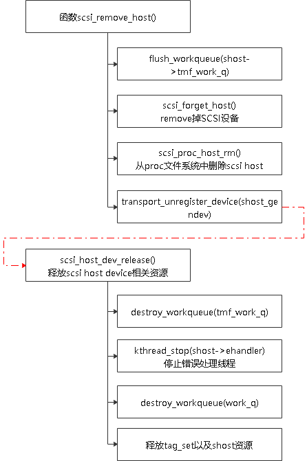 Scsi host的释放是由函数scsi_remove_host()实现的,在这里需要注意的,shost->shost_gendev的unregister将引用计数减为0时,才会调用scsi_host_dev_release()做shost_gendev相关的资源释放。