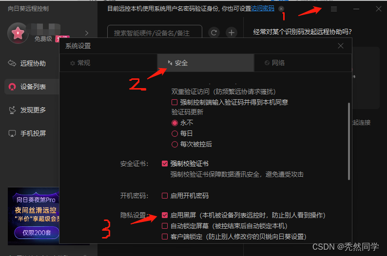 首先,先确保自己向日葵客户端开启了黑屏模式: