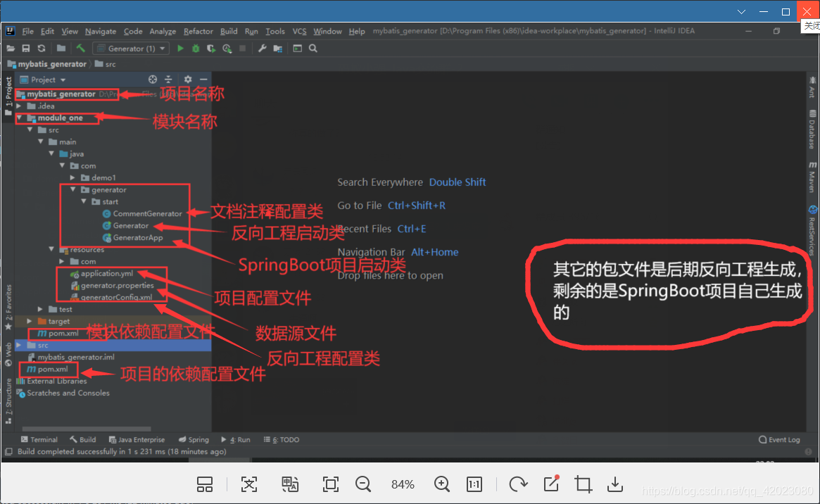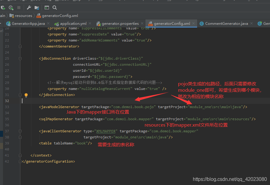 我项目取名为mybatis_generator,见名知其意,模块取名为module_one。我一开始直接在项目下开始了导入依赖,粘贴进生成器类,resources下的所有需要的文件,然后执行生成器类的时候,一直生成不了文件,报错:The specified target project directory mybatis_generator\src\main\java does。不明白什么原因,解决办法是,pom文件的依赖不用更换就在项目的pom文件里就好,但是其它的文件,需要放在新建的模块中才行。