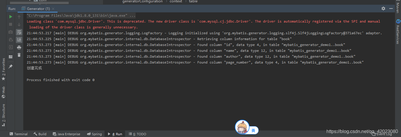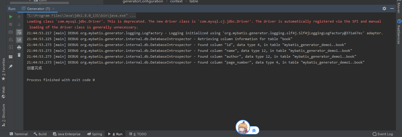 生成了需要的pojo文件、mapper接口和.xml文件。控制台的信息输出如下图所示: