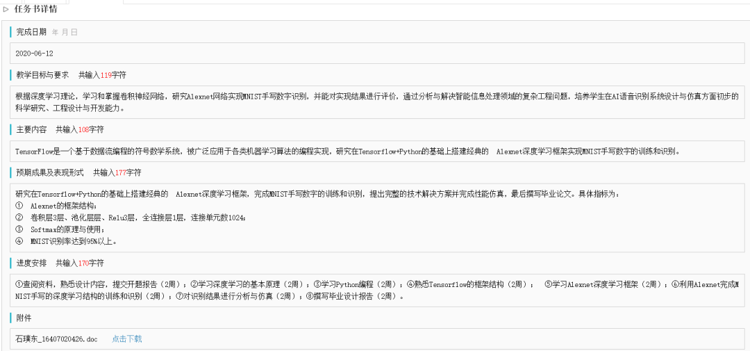 以我的毕设题目为例,其名称为基于TensorFlow的深度学习研究与实现,第一步,我们先找出题目的关键词(即为TensorFlow与深度学习);第二步,我们通过查阅学校教务处网站找到对该毕设的要求,如下所示: