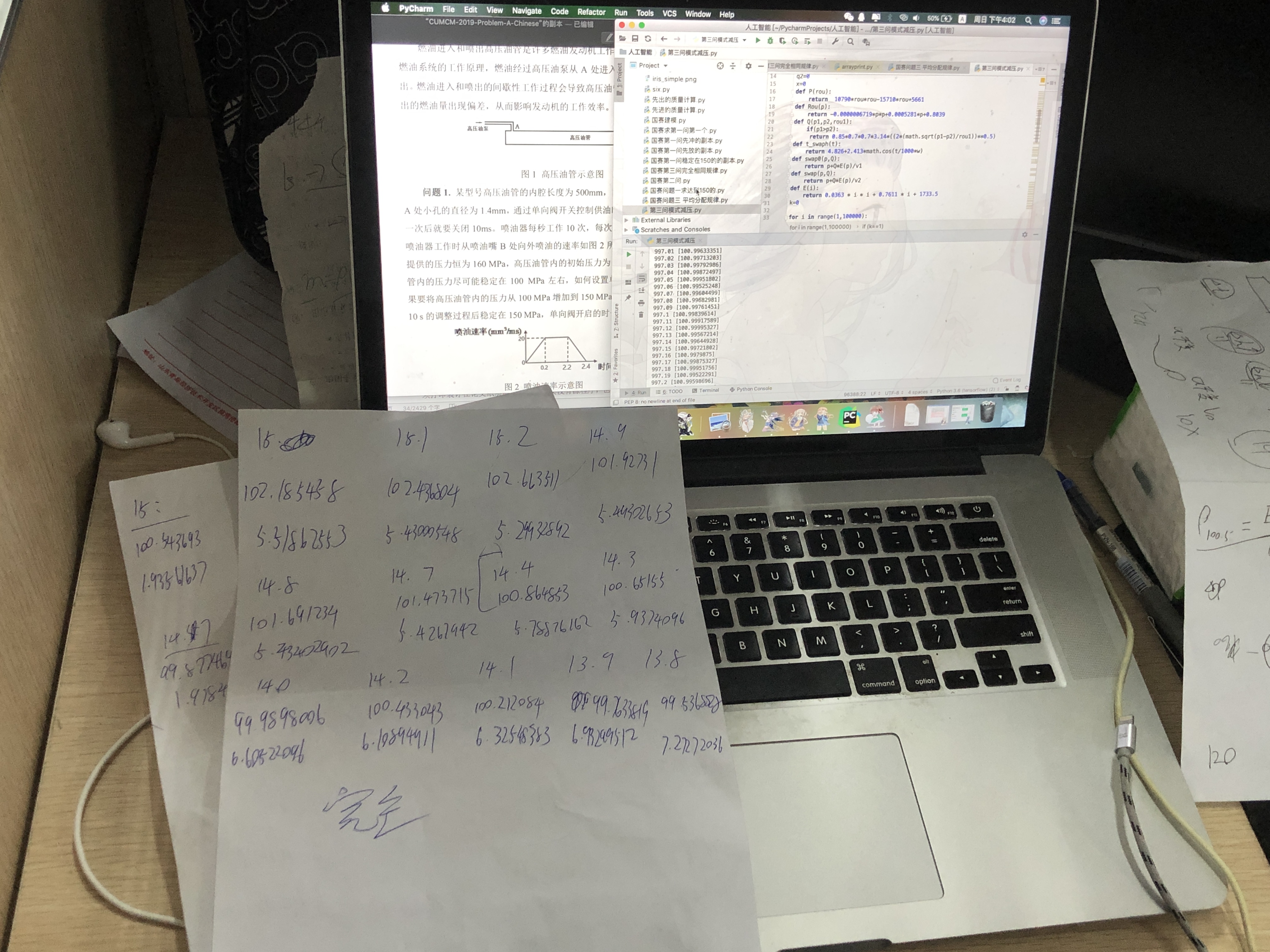 9.14号晚上六点开题,当时我在外面吃饭,队友一个照顾新生,一个应该六点下课,所以我们大概6.30左右开始看的题,当时咋一眼看的想法是:A好复杂啊,感觉是个热力学相关的问题;B看着读起来好简单,但是具体下去肯定比较复杂;C看着也不难,如果给数据,什么决策树相关的分析决策相关因素、神经元模型、层次分析法分析相关因素和依赖性、排队过程用仿真或者一些类似粒子群等求最优解等方法解决第三、四问等等,初始思路感觉比较广。(只是咋一眼看题的感想,具体是否正确本人不能保证哈,因为后续也没研究C题),我与另一个建模手先对B题进行初步分析和解决第一问,我们发现这个问题虽然题目很清晰,但是也对应的所给信息太少,例如一些受力点或者一些情况,我们所想就很容易产生分歧(因为题目支持太少,无法确定什么是最符合题意的),再转而对A题进行分析(这个光读就有点麻烦,但是也因为麻烦,许多公式等都很明确),根据公式,我们推导了一下公式(这个由于我一个队友的推导能力很强- -,所以比较容易解决了)发现A题相对比较明确,而且题目公式给的很全,而且题目初步感觉都能理解。例如第一问给的高压油泵是恒定压强的(也代表里面密度相同)、喷油嘴的规律也给了规律曲线;第二问中,高压油泵变成了一个凸轮挤压的过程,即高压油泵被周期性运动的凸轮挤压其密度、压强也随之改变,而如果高于内部压强也会有质量转移到高压油泵,同理 凸轮也是一个周期性变化的,当时我们想法是:解决了第一问,将第一问设计的三部分(高压油泵、高压油管、喷油嘴)其实第一问给定的全换成新推出来的周期性数据即可;第三问,新增一个喷油嘴?直接在系统里面在加个喷油嘴再运行模型不就ok了?第三问第二个- -没看懂 管他那 先做完前面的再说!