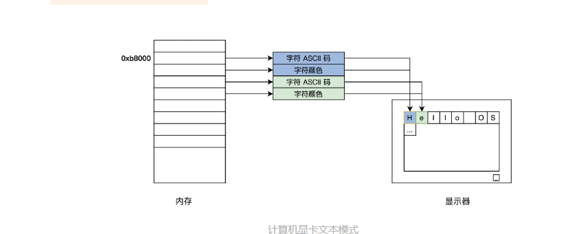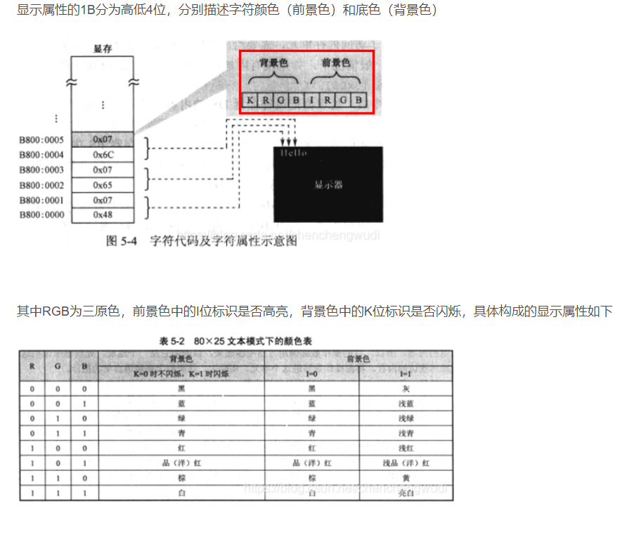 在字符模式下,它把屏幕分成 24 行,每行 80 个字符,把这(24*80)个位置映射到以 0xb8000 地址开始的内存中,每两个字节对应一个字符,其中一个字节是字符的 ASCII 码,另一个字节为字符的颜色值。如下图所示: