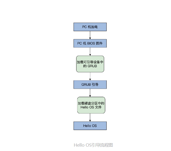 BIOS被固化在主板上的ROM中,PC加电后,第一条指令由从BIOS中执行,它的作用大致是:检查初始化CPU、内存、主板平台,加载磁盘第一个扇区的内容到内存的0x7c00起始地址处,并跳转到0x7c00处继续执行,次此实验就是gruby引导程序。