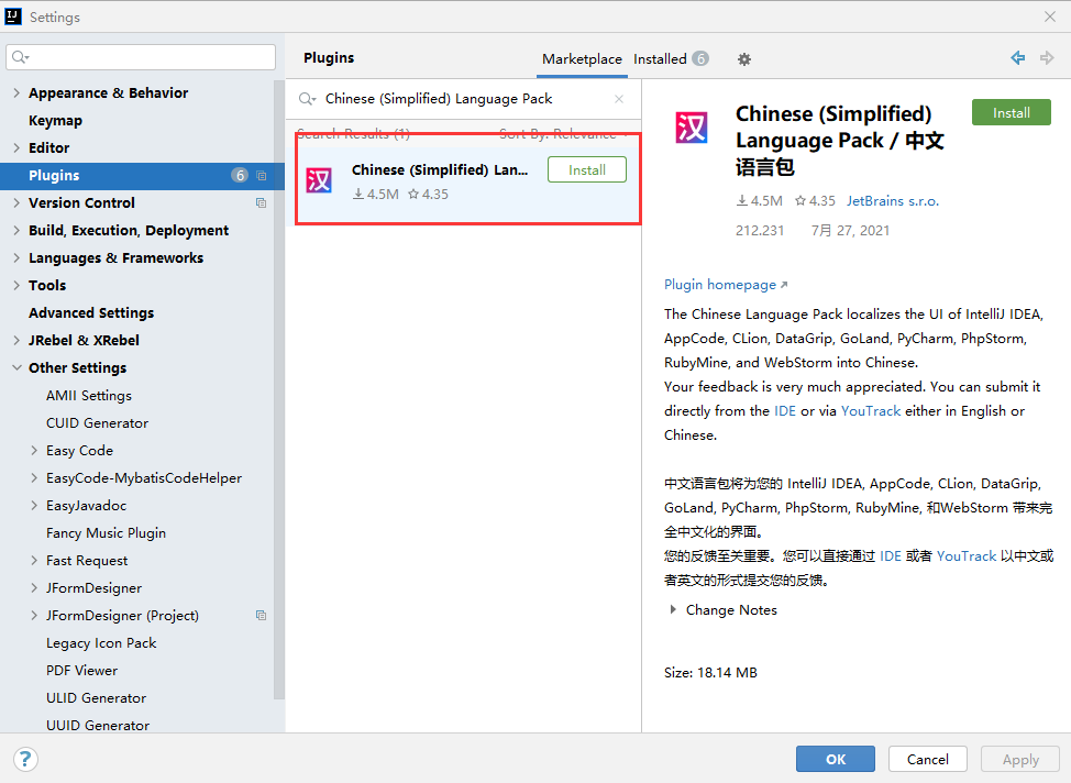 IDEA插件系列(52):Chinese (Simplified) Language Pack插件——中文语言包