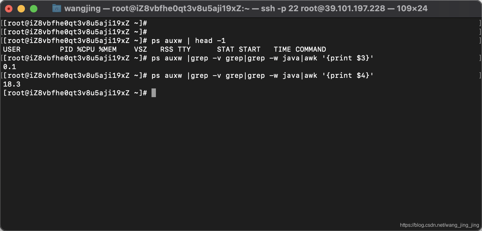 2.2:查看java进程占本机的CPU百分比:ps auxw |grep -v grep|grep -w java|awk '{print $3}'