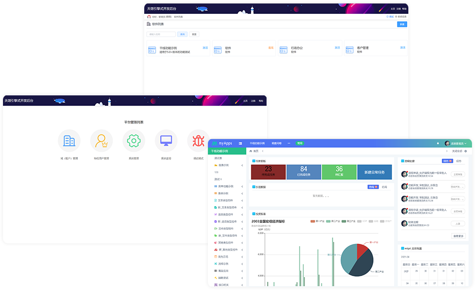 在天翎myApps低代码开发平台可以快速构建出OA协同、CRM、ERP进销售存、公文督办、KM文库、项目管理、采购管理、生产管理、供应链管理等一些列职能类和业务类管理系统。
