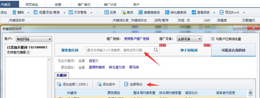 在助手的关键词栏选择添加,会弹出加词框,在加词框中输入种子词,即可搜索出很多关键词。有点类似于关键词规划师后台的“海量拓词”,但用助手操作更加方便,找好之后直接导出。分好之后即可传至账户。