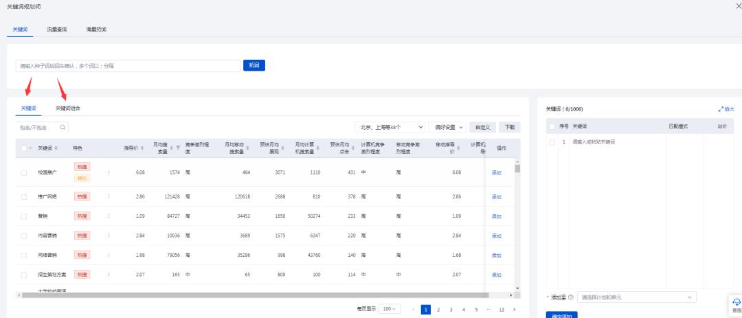 在关键词的右边是“关键词组合”,里面是对某一类词进行了打包,添加即可投放一批词。但需要注意的是,在后台不要直接添加,因为系统对这些词的打包并不是很精准,里面有些词性不是太一致。可以导出分好后再加入账户。