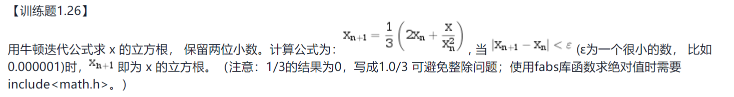即为 x 的立方根。(注意:1/3的结果为0,写成1.0/3 可避免整除问题;使用fabs库函数求绝对值时需要include