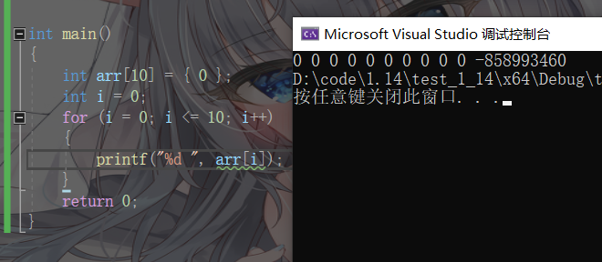当i = 10的时候越界访问了,访问了不属于他开辟的空间,但是编译器不一定会报错