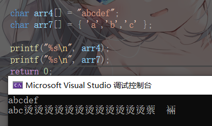 在打印字符的时候遇到\0才会停止,第一种在内存中后面会默认隐藏存放一个\0,而第二种没有,所以会打印一些字符烫烫烫烫,要分清楚双引号引起的字符和单引号引起的字符